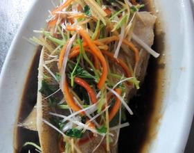鱼蒸好后拿出来倒入蒸鱼豉油,撒上辣椒丝和葱姜丝!