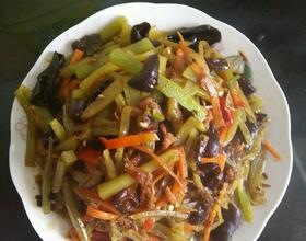 - 6. 倒入提前准备好的木耳,胡萝卜,莴笋,辣辣简单翻炒三分钟即可出锅装盘