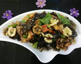 - 9. 肉放一边,放木耳,盐翻炒均匀。