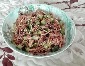 - 9. 当黄瓜炒约30秒,倒入黑豆面,一同翻炒。