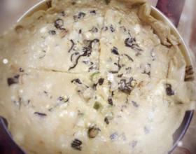 把搅拌好的糊倒入电饼铛,快熟时切成四份