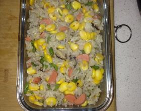 在倒入玉米粒、加少许盐,翻炒、倒入火腿肠丁