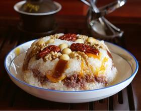 - 6. 最后,同上上步再铺上一层糯米饭,压压实。蒸15分钟左右,取出后,碗边用刀刮一下,倒扣出来就好啦~开吃