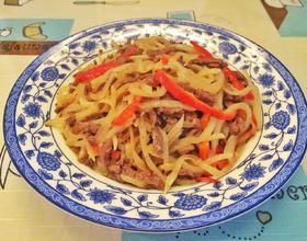- 4. 将锅中倒入适量的食用油,倒入红辣椒丝翻炒