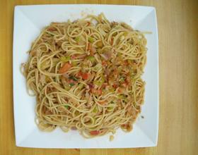 锅烧热,里面放入些许油,倒入番茄酱跟意大利面翻炒均匀,放少许盐。出锅后将配菜盖在上意面。