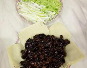 - 10. 拿出豆皮,卷上葱丝,黄瓜丝,肉丝,一口咬下去,味道棒棒的。