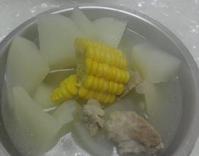 将猪肘加一勺食盐用砂锅煮至软烂时加萝卜玉米继续煮到萝卜软烂就可以加食盐调味出锅。