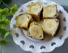 平底锅加少许油,把香蕉卷放进去小火煎,四面都要煎一下。
