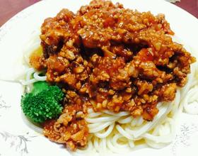 做好的肉酱淋在意面上,西兰花摆盘,香喷喷的意面就做好啦
