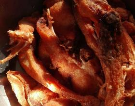 第一遍全炸好后把之前的复炸一下,至微红色即可,如果要吃脆的可以炸时间长点。要吃回卤的话就先调好卤汁,可以用生抽,适量老抽,五香粉,葱花,砂糖,少量的番茄沙司,加少许水烧开备用,鱼块炸好时趁热放入锅内翻炒上味,热气腾腾的熏鱼块就好了!