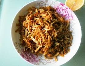 1.原材料并不是固定不变的。也可以加入蛋皮丝,胡萝卜丝。根据自己的喜好来。2.炒的时间不能过长,过火不好吃。3.出锅前可以加入味精或鸡精,我们家不吃这些。