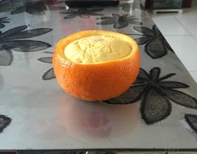如果有条件,可以把出锅的蛋羹连同橙壳放入高脚杯中。更加美观。