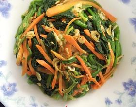 油加热后放入小量虾皮 把菠菜和胡萝卜放入翻炒在根据自己的口味放少量的盐(因为虾皮是有咸味的)