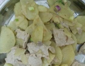 土豆煮透松软,这时候放入精盐,然后下入炒熟的猪肉片翻炒片刻,最后加入葱花翻炒几下即可起锅咯