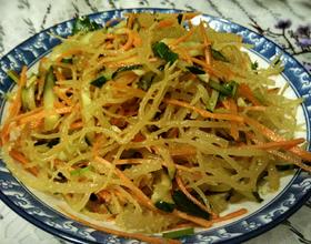 龙须菜沥干水,和胡萝卜黄瓜丝放入大点的容器中。