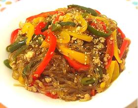三椒翻炒一两分钟后、下入事先泡发好的粉丝