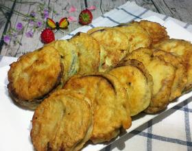 平底锅烧热到油,把裹了面糊的茄子逐个放入