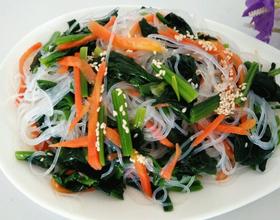 - 14. 将胡萝卜丝,菠菜,粉丝装入一个大的容器内。加入盐、白糖、白醋。搅拌均匀。