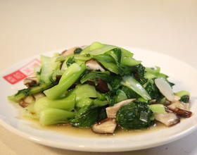 - 5. 锅烧热下油10克,下葱姜蒜爆香,放入油菜、香菇。