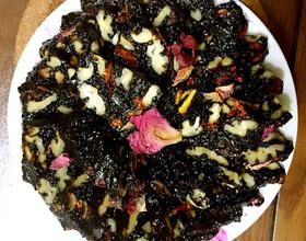 切片时可垫上芍药花片,切时可以防粘手,芍药药性活血化瘀,和阿胶同性属热