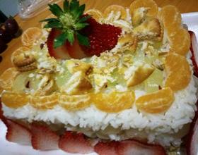 找个家庭用的长方形打包盒,垫一层米饭加一层香蕉,再加一层米饭铺一层核桃仁,铺一层米饭葡萄在铺一层米饭,倒扣在盘子上。
