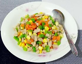 将玉米粒、胡萝卜粒跟青椒粒倒进去中火翻炒2分钟下点盐即可上锅。