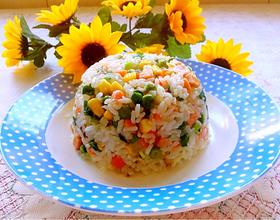 什锦和虾仁我是分开用开水烫过的,炒饭的时候少放食用油和盐,这样不仅可以吃些辅菜也更能体现食材原本的味道。