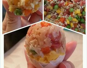 儿子喜欢糯米饭,今天我捣鼓出来还不错,介绍下糯米要泡,蛋弄个小口,把蛋清倒出留蛋黄,在将米和自己喜欢的料拌下塞进蛋中在蒸熟,就可以了