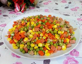 - 6. 放玉米、豌豆、红萝卜、火腿肠、翻炒片刻