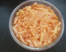 挤干萝卜水,撒上白糖,用手揉搓匀。