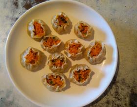 食材,切韭菜,胡罗卜切碎,香菇开水烫一下,捞出备用。