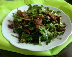 香菜上放鸭胗片,大蒜末、辣椒、老抽、鸡精,煸香的油拌匀既可……