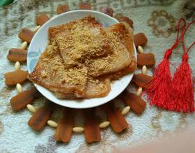 装盘时洒上花生粉。香甜软糯的煎年糕就可以吃了!