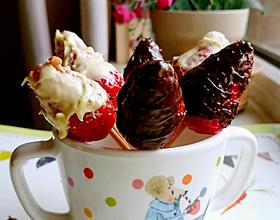 巧克力放入微波炉 中低火解冻档打两分钟 将巧克力融化 将草莓转圈粘匀巧克力酱