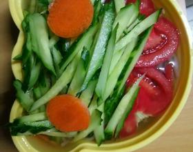 把过好冷水的冷面放到碗里加入准备好的糖、醋,再加入250g冷水,最好冷开水,加入韩国辣酱,放入切好丝的黄瓜,切片的西红柿,胡萝卜,摆盘,吃时搅拌均匀就可以啦。