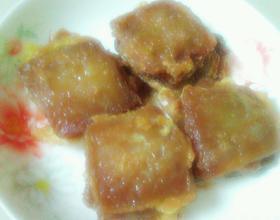 平底锅里放油烧热,放入粘了蛋液的年糕,小火慢慢煎