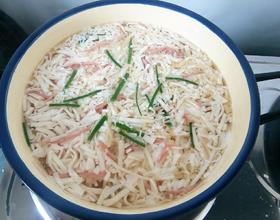 汤锅水开倒入豆腐丝,火腿丝,烧开,加一点点盐,一点油,鸡精即可