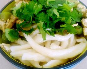把面放在盘子里,按平,用筷子蘸水开始顺着边向开水锅中拨面