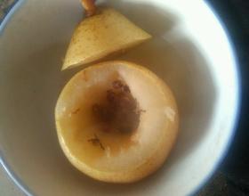 挖空的梨里面放20粒花椒,2粒冰糖,对并放碗中。上锅蒸半小时左右