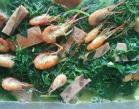 飞水汤倒入炒锅里,放入飞过水的金花菜!继续加热!