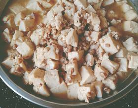 锅中入油 带油熟后放入肉沫炒至 带肉变颜色后放入少许酱油增色 然后放入豆腐 稍炒后放盐然后入水 顿至