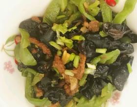 入油,下肉丝炒断生即可,盛出,姜蒜入锅出香,青椒入锅翻炒,再加入木耳翻炒