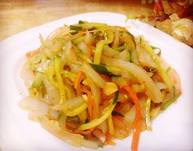 冷藏好后拿出,用工具刨成丝,黄瓜和胡萝卜洗净分别切成丝,放入蒜末、辣椒油和麻椒油