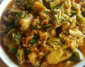 放少量的大豆油炸锅放炸透的茄子左香元酱填少量的水,,烧开