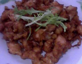 炸的时候会有馒头屑与鸡肉分开,这就是偷懒的后果,因为家里没有面包屑。