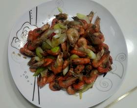 河虾变成红色加椒盐粉,盐炒匀装盘即可。