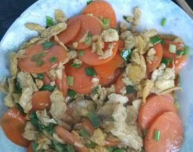 待胡萝卜炒熟后导入鸡蛋继续翻炒5~10分钟,洒些葱花,放好味精,调均匀就可以装盘了