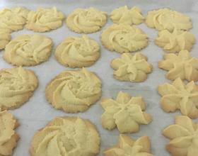 把糊糊装入裱花袋或专用挤曲奇道具(我没有),挤出花型。