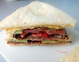 午餐肉根据个人喜好煎或不煎,蔬菜,肉类,任意摆放,切边要压好一刀下去,酱任意抹,成品可以用保鲜膜包好,冷藏,微波炉热会即可食用