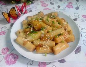 热锅放油、放猪肠粉、小火慢炒、炒至猪肠粉热透